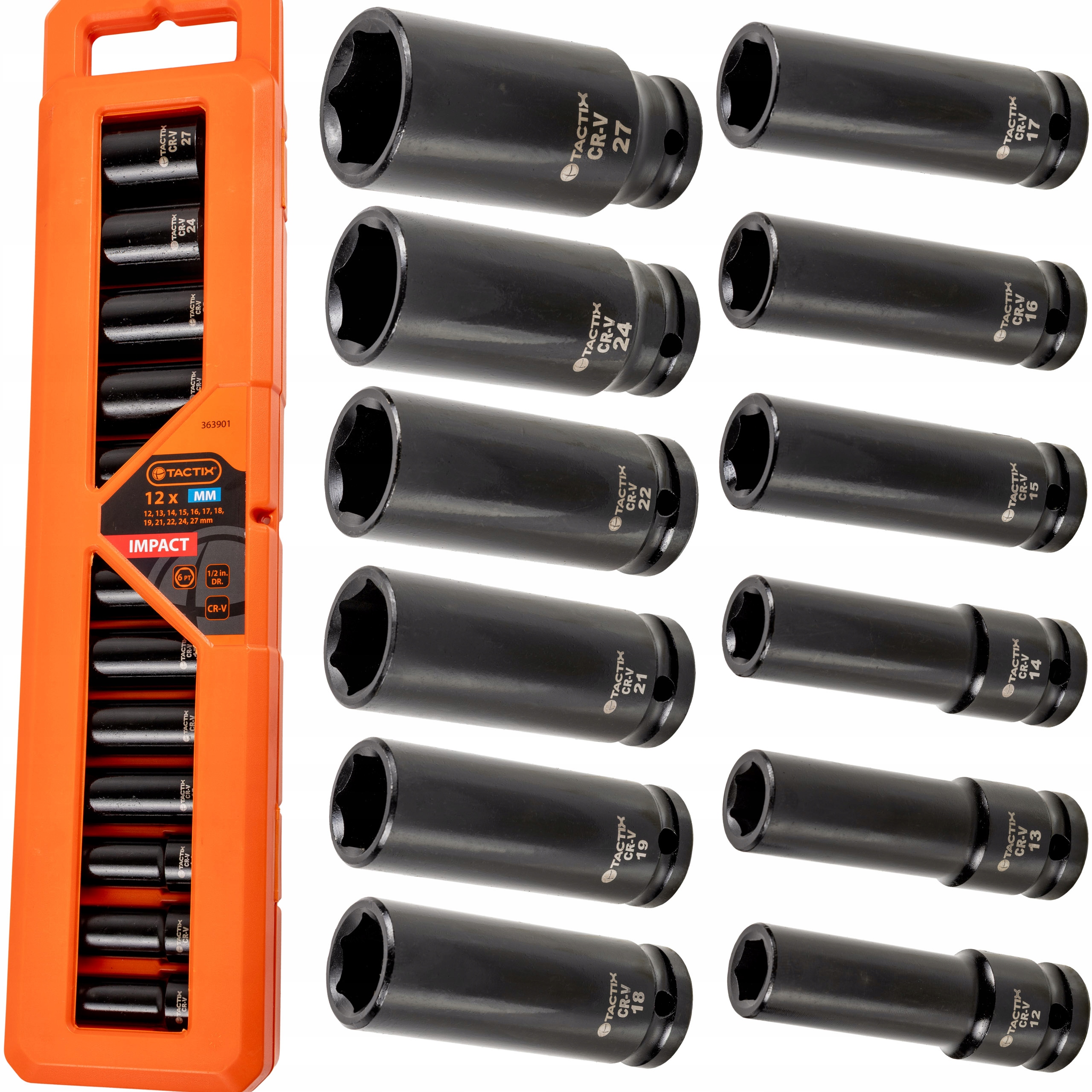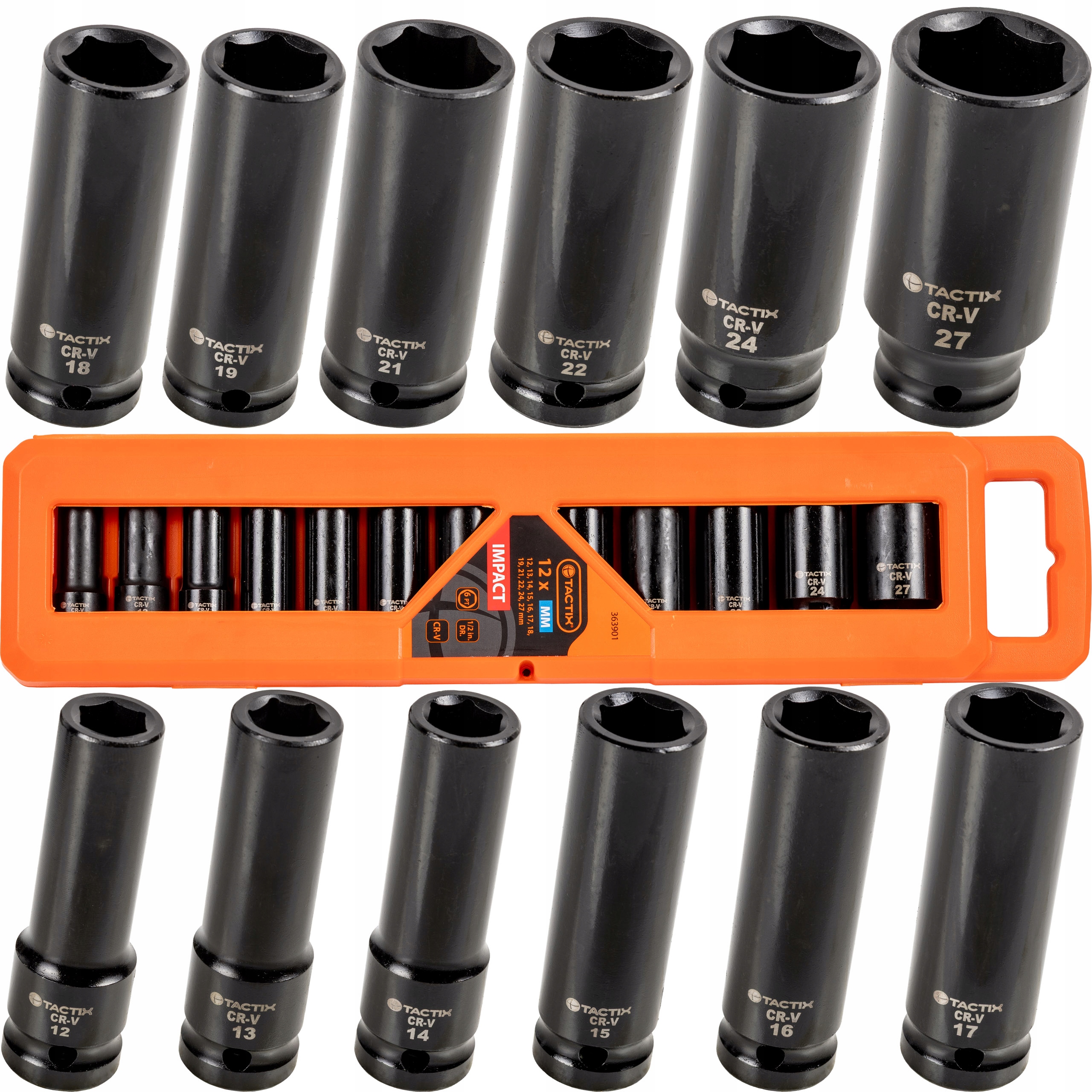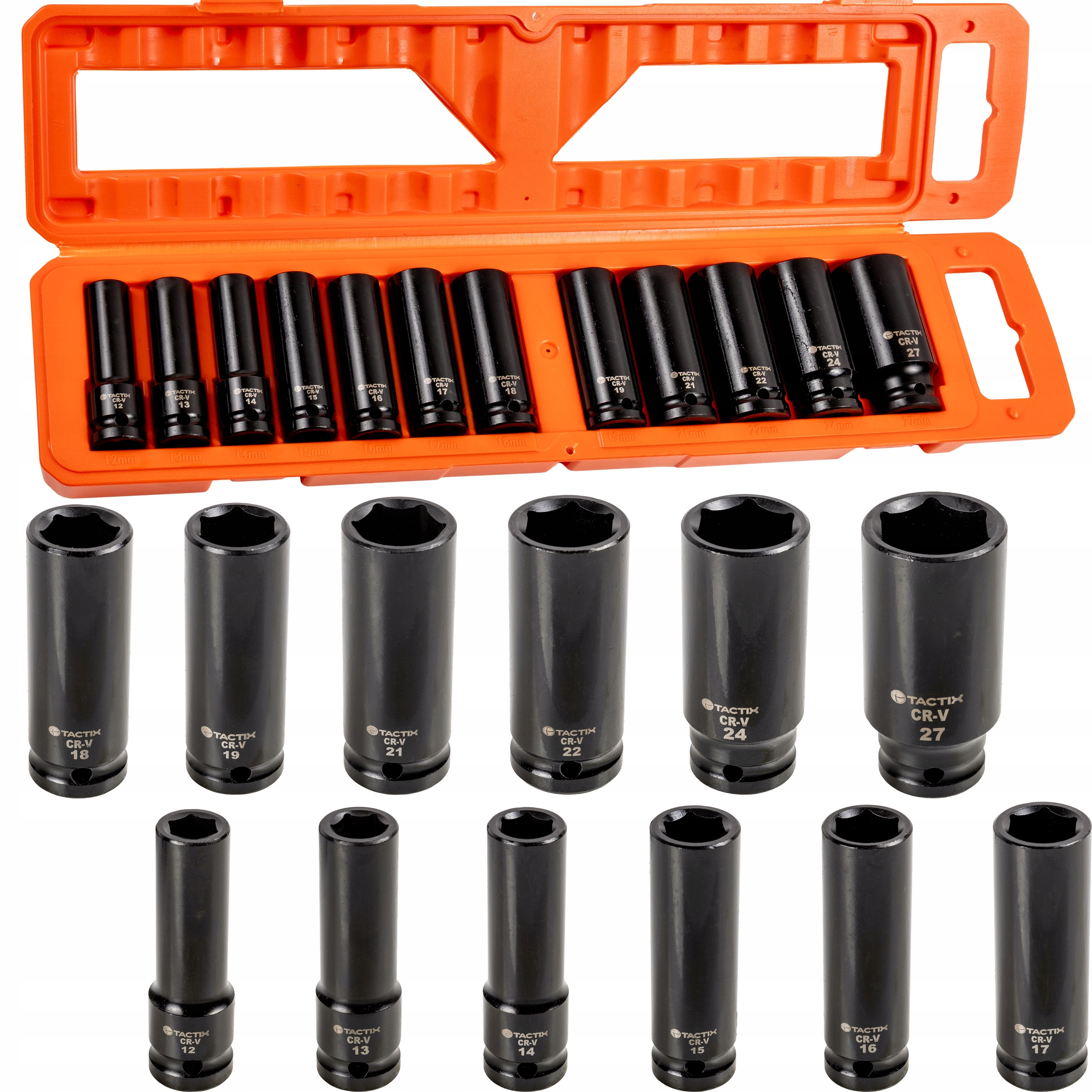 Nasadki w rozmiarach 12, 13, 14, 15, 16, 17, 18, 19, 21, 22, 24, 27 mm zaprojektowanye do pracy z kluczami udarowymi 1/2″. Wykonane z hartowanej stali, z czarnym wykończeniem, co zwiększa odporność na korozję i poprawia wygląd narzędzi. Całość zapakowana w eleganckie, solidne pomarańczowe pudełko wykonane z tworzywa PP, które chroni nasadki i ułatwia ich przechowywanie.