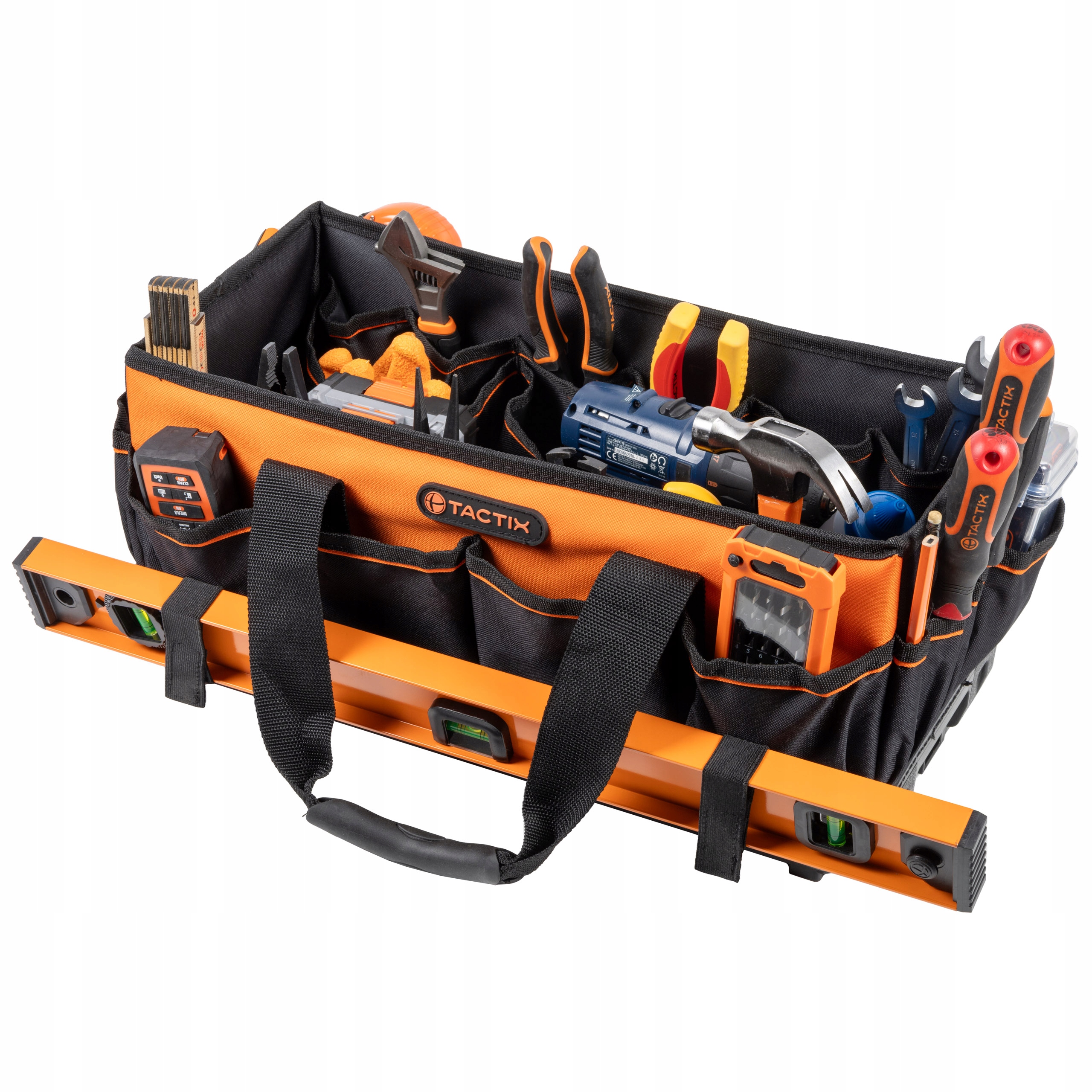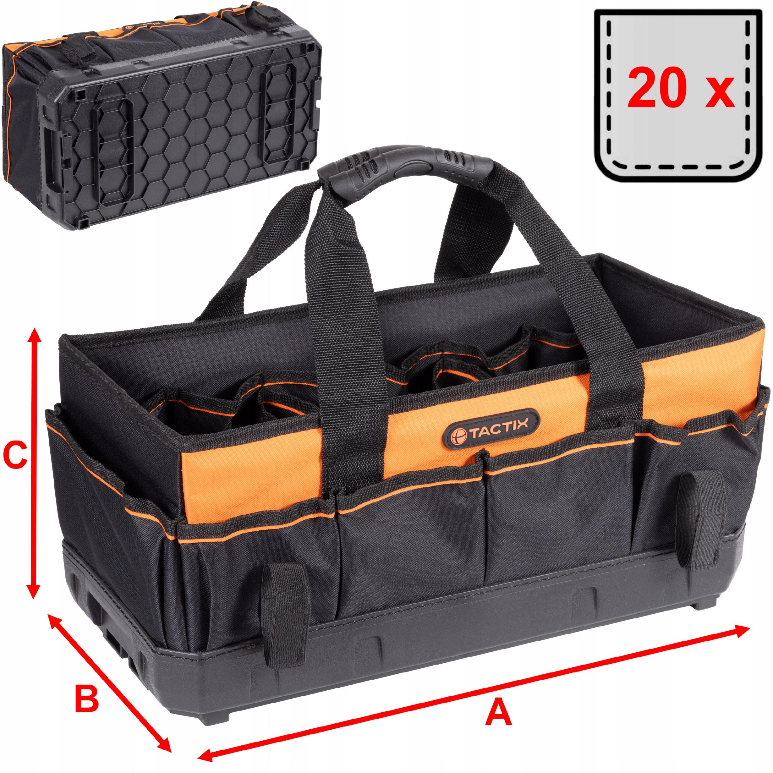 Wytrzymała torba z nylonu wzmocniona metalowym stelażem i dnem z twardego tworzywa. Posiada 33 kieszenie i mocowania, w tym kieszenie wewnętrzne oraz zewnętrzne, duża kieszeń z suwakiem, uchwyty na poziomicę oraz metalowa klamra.