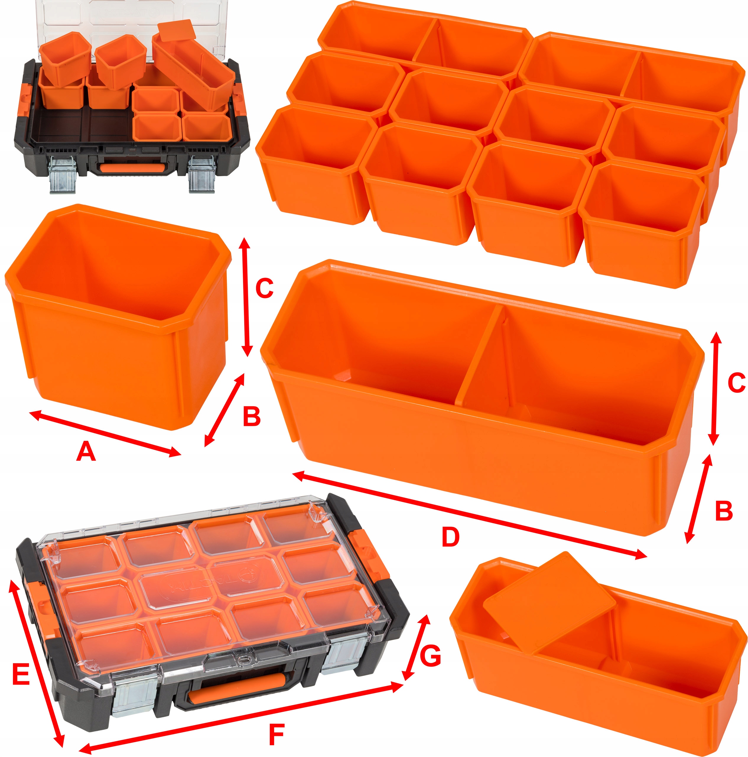 Organizer z przezroczystym wiekiem poliwęglanowym wyposażony jest w 8 małych oraz 2 duże pojemniki na śruby, kołki i drobne elementy. Pojemniki posiadają uchwyty umożliwiające zawieszenie ich na tablicy narzędziowej.
